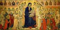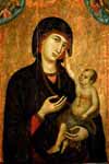 sproporzionata rispetto alle figure che la circondano. Un'altra opera di Duccio di Buoninsegna è la Madonna dei Francescaniche si trova alla Pinacoteca Nazionale di Siena, per alcuni quest'opera è ritenuta prodotto giovanile per altri è da considerarsi più tarda. La piccola pala ha uno sfondo quadrettato tipico delle miniature gotiche francesi.